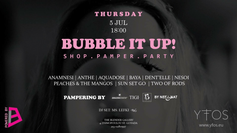 Την Πέμπτη 5 Ιουλίου, μεταξύ 18.00 και 00.00, θα πραγματοποιηθεί στη The Blender Gallery ένα καλοκαιρινό bubbly session για όσους ψάχνουν ευκαιρίες για shopping, pampering και party! Με σκοπό την υποστήριξη της Ελληνικής μόδας, επιλέχθηκαν 9 brands τα οποία θα παρουσιαστούν κάτω από τη στέγη της The Blender Gallery, ενώ παράλληλα επαγγελματίες απο τον χώρο της μόδας και της ομορφιάς, θα σας περιποιηθούν και θα σας συμβουλέψουν! Η μοναδική Ms Lefki θα είναι στα decks, ενώ στο μπαρ θα φιγουράρουν τα αφρώδη και εθιστικά κοκτέιλ Flirtini και Aperol Spritz, pink lemonade μυστικής συνταγής για όσους κάνουν αποτοξίνωση, και 3 επιλογές βιολογικών κρασιών της σειράς B by Nadia Boule. Μάλιστα για πρώτη φορά θα δοκιμάσουμε το ολοκαίνουργιο Dulcinea.