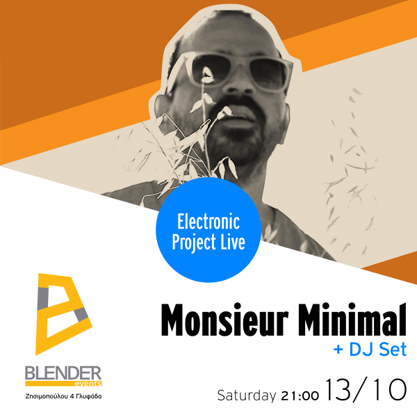 H The Blender Gallery υποδέχεται το φθινόπωρο με ένα Opening Party στις 13 Οκτωβρίου συνεχίζοντας το Live Art Project! Πρώτος καλεσμένος της σεζόν ο Monsieur Minimal με ένα Live Electronic Project που θα συνεπάρει τους θεατές με τους chill out ηλεκτρονικούς ήχους του. Ιndie Retro Pop, Vintage Pop, Romance Pop & electronica ήχοι σε ένα live με τις μεγαλύτερες επιτυχίες του Monsieur Minimal θα γεμίσουν την The Blender Gallery στο Opening Party της χρονιάς!