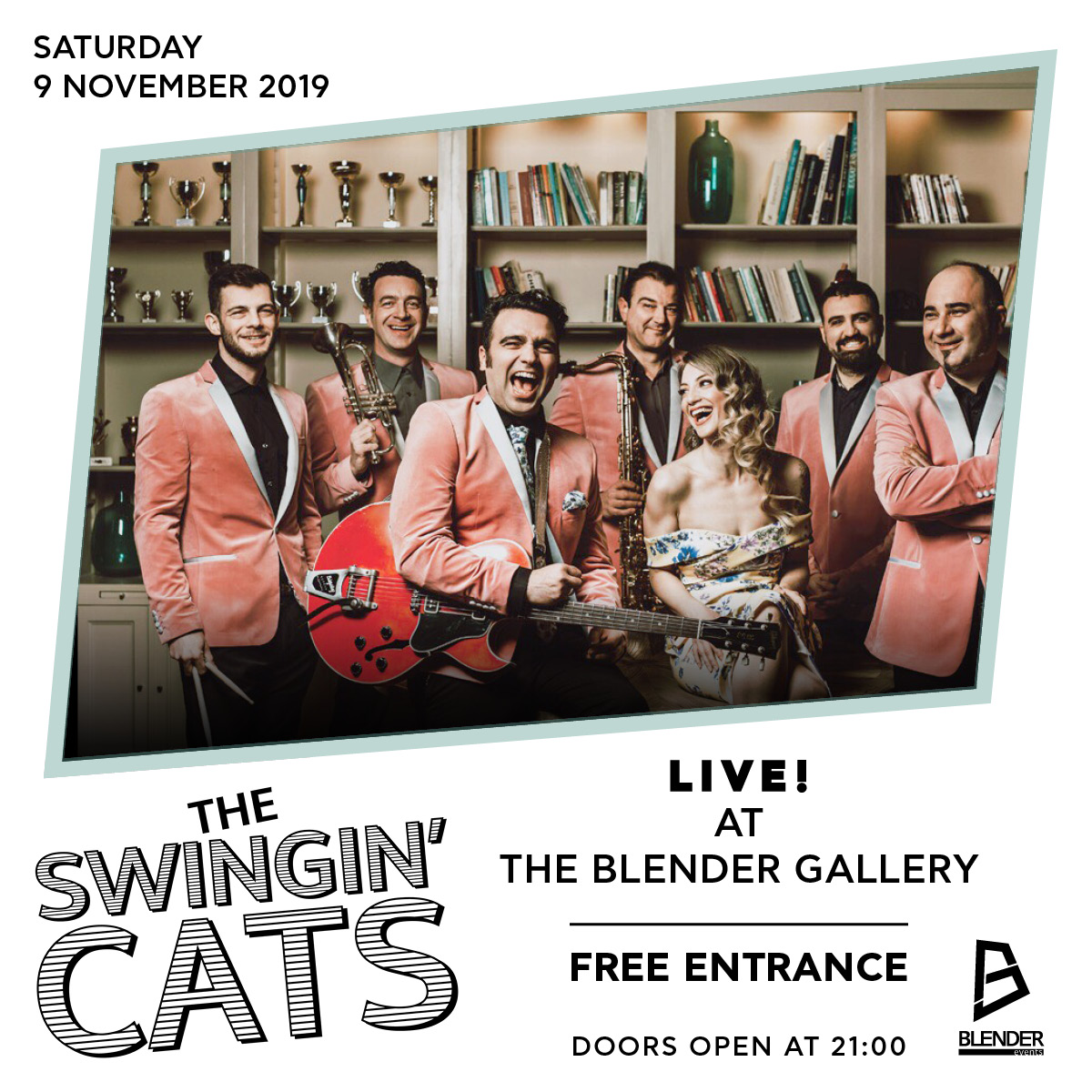Οι The Swingin' Cats, έρχονται για πρώτη φορά στην σκηνή της The Blender Gallery το Σάββατο, 9 Νοεμβρίου για να ξεσηκώσουν μικρούς και μεγάλους με ξέφρενες swing και rock n' roll μελωδίες και τραγούδια που νικούν τον χρόνο, σε retro ατμόσφαιρα. Κοφτά κιθαριστικά ακόρντα, τύμπανα να δίνουν το ρυθμό και πνευστά να απογειώνονται από στον τόσο απλό μα ξεσηκωτικό shake ρυθμό!